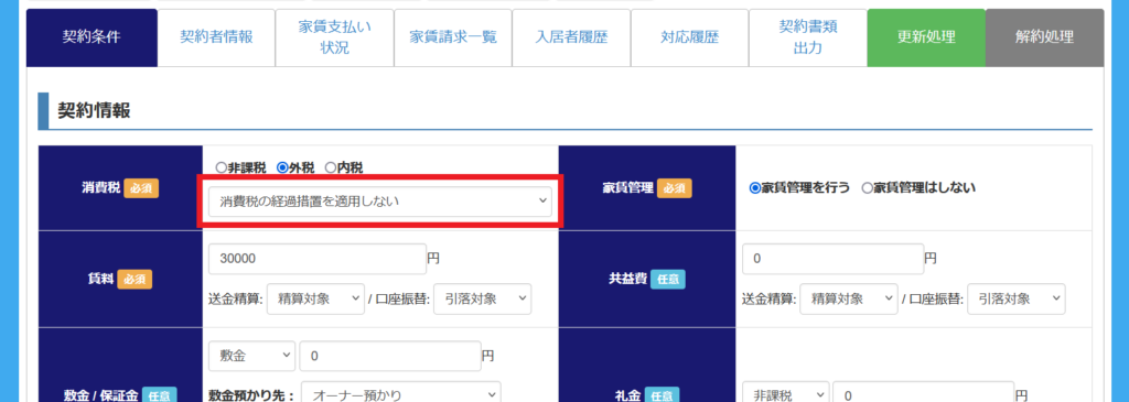 ここでは、契約情報の【消費税】にある「経過措置の適用」について説明します。