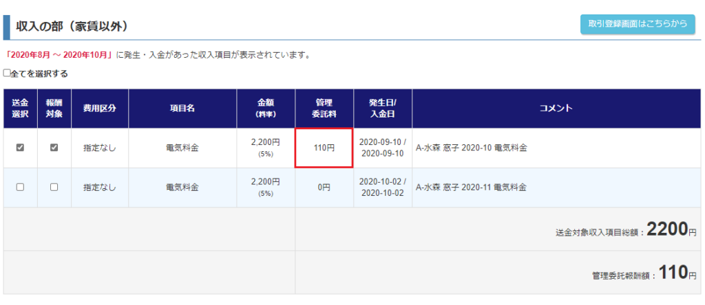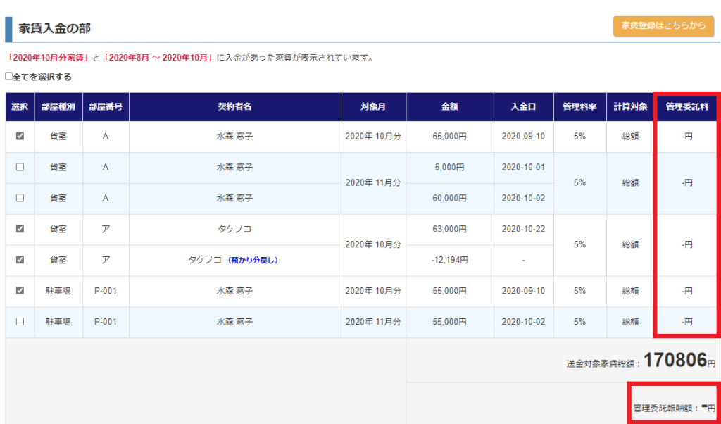 送金対象家賃総額と送金対象収入項目総額に管理料率をかける設定になります。