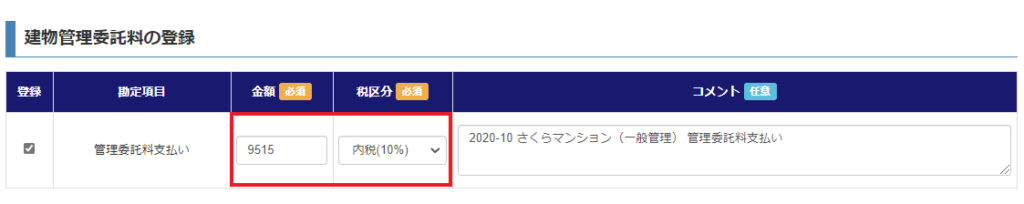 建物管理委託料:8650円と管理報酬額の合計がそのまま反映します。