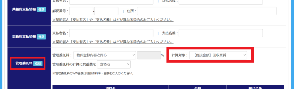 そのため契約情報画面にて、管理料の計算対象を「税抜回収家賃」に設定いただく事で、税抜家賃×管理料(%)×消費税とする事ができます。