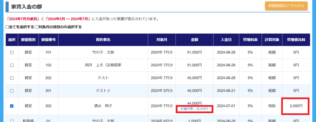 「管理業務」から物件を選択>スタッキングプランから契約者をクリック>「契約情報」を選択>契約情報画面の【管理委託料】にて「税抜金額 回収家賃」に設定して下さい。その後、入金登録を行います。