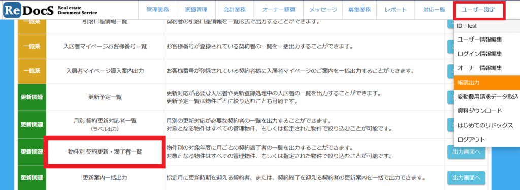 ユーザー設定>帳票出力>『物件別 契約更新・満了者一覧』の出力画面へ移動します。