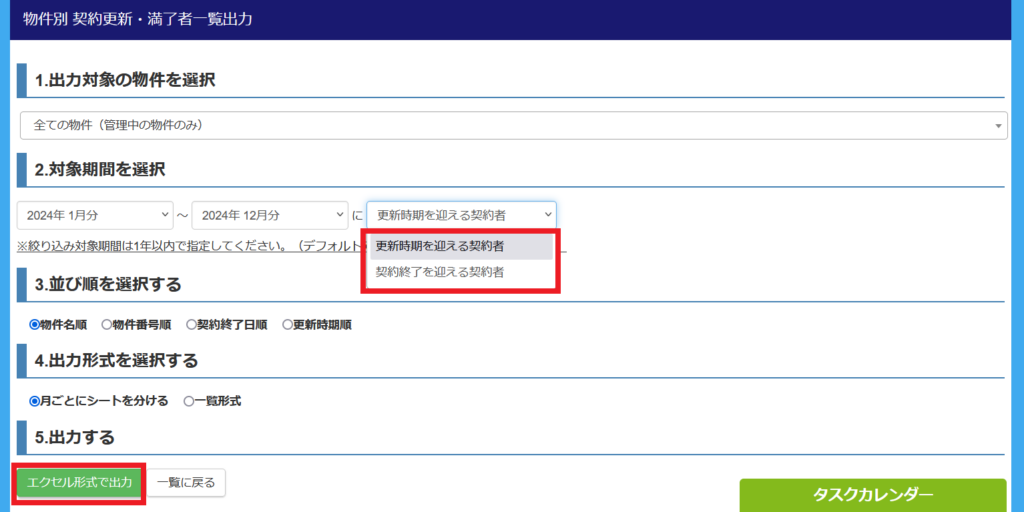 『物件別 契約更新・満了者一覧』画面に移動すると「2.対象期間を選択」で『更新時期を迎える契約者/契約終了を迎える契約者』それぞれ選択ができます。