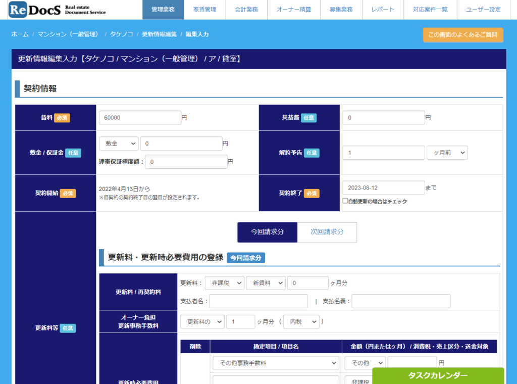 このケースの多くの場合は、更新仮登録の画面にある『更新後の契約情報』から修正することが可能です。