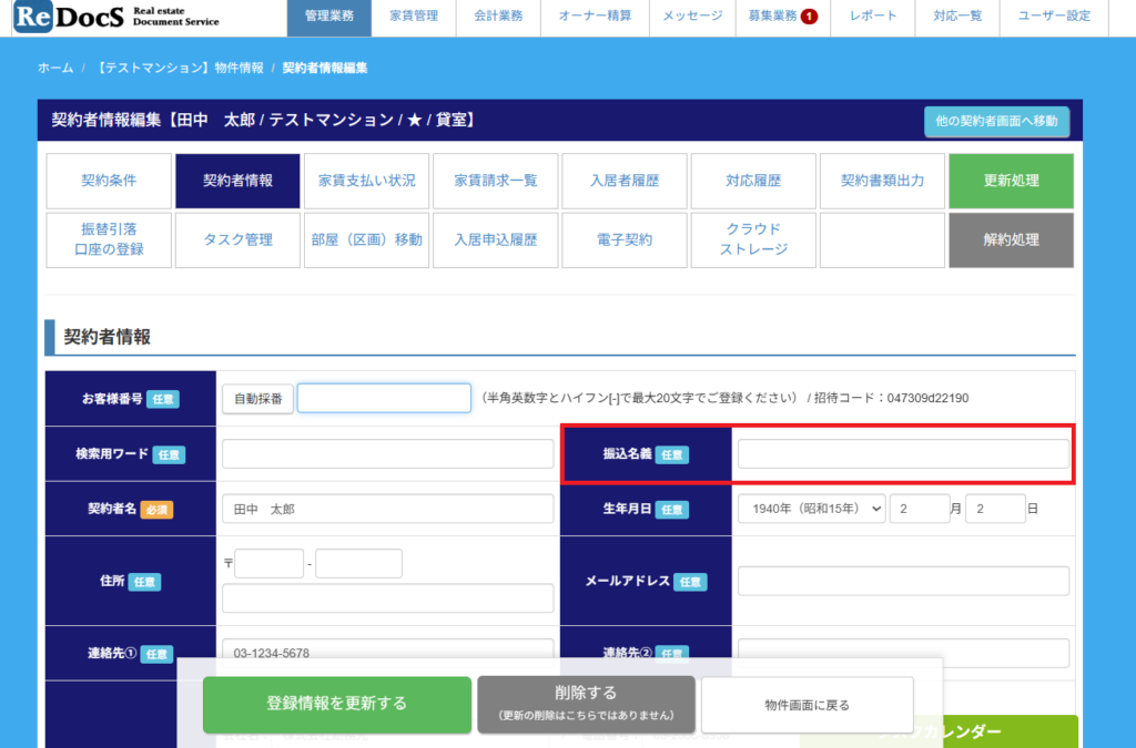 ➂コピーした振込名義を契約者情報へ登録して行きます。