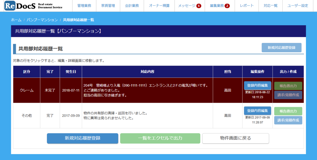 共用部対応履歴一覧では「共用部対応履歴」として登録された項目が表示されています。