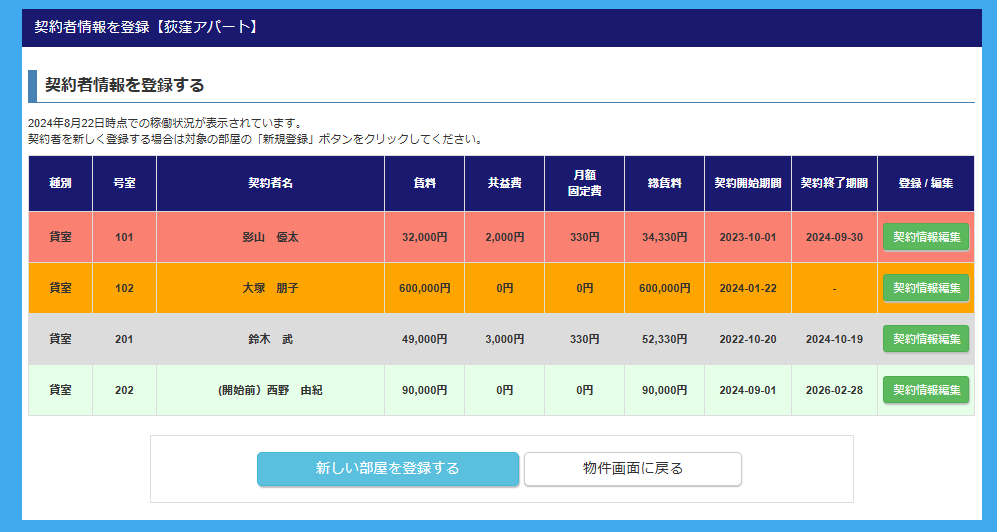 | 契約者名 | 現在(画面を開いていている日付)契約中の契約者が表示されます。 現在空室で、1ヶ月以内に契約開始予定の契約者がいる場合は、その契約者が反映されます。 |