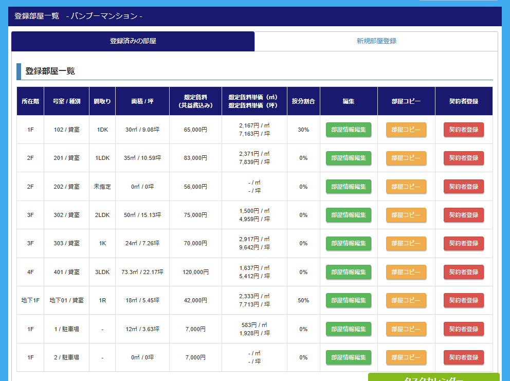 | 按分割合 | 部屋情報登録画面の詳細情報で登録した「按分割合」が反映されます ※按分割合については、[変動費用請求-割合按分での登録]の画面で利用します。 |