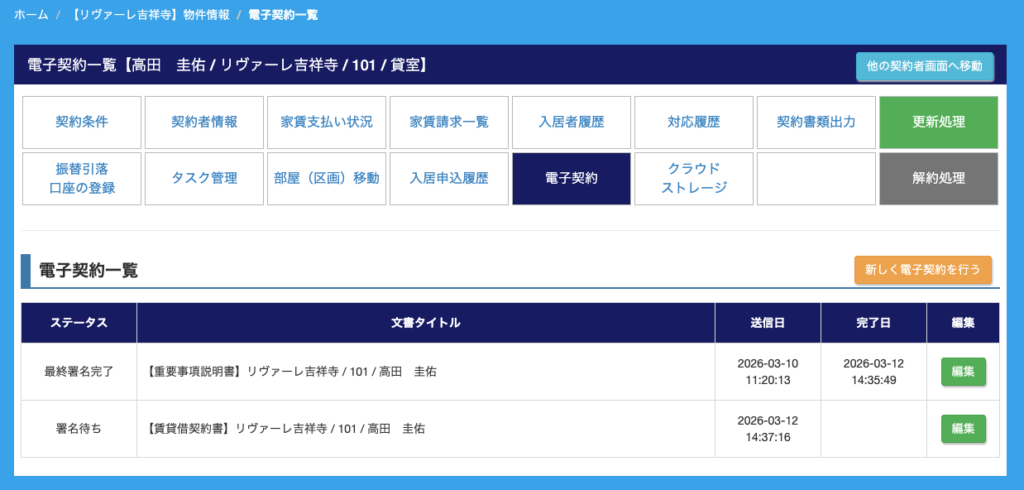 この画面では、該当の契約者でこれまで送信した電子契約の一覧が表示されています。
