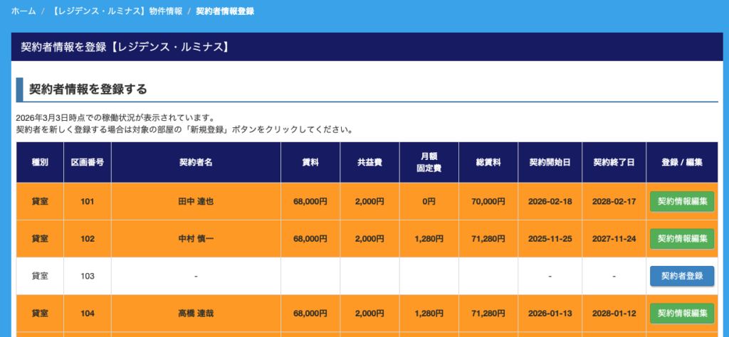 レントロールと同じ内容が一覧として表示されており、ここから新規の契約者情報を登録したり、既に登録されている契約者情報の編集画面へアクセスしたりすることができます。
