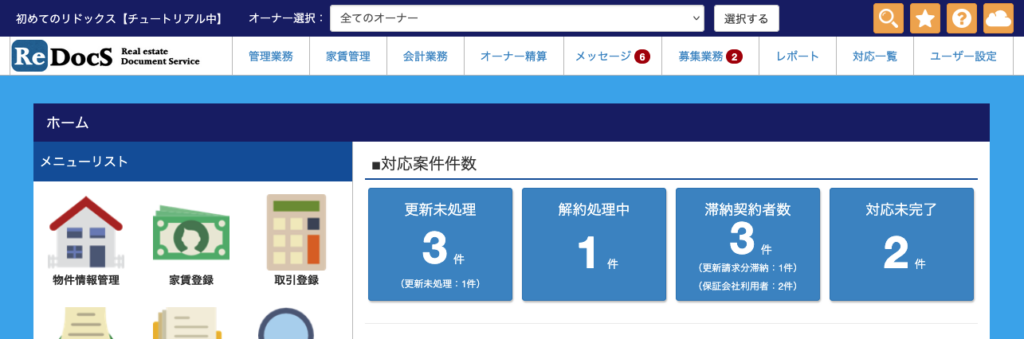 ホーム画面では「更新対応数」「解約対応数」「家賃滞納者数」「未完了対応履歴数」を一目で確認することができます。