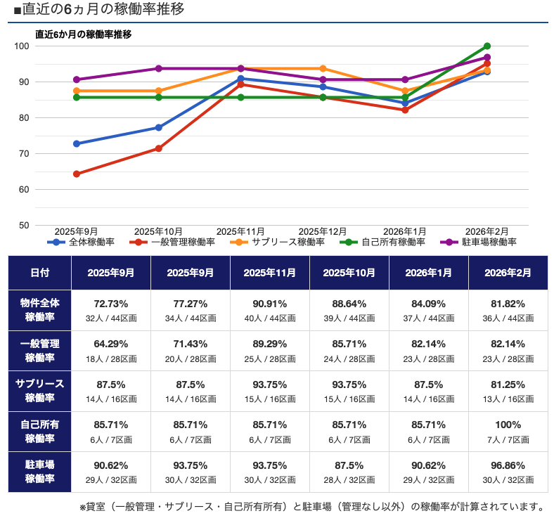 | 一般管理 稼働率 | 「物件全体稼働率」に記載のデータの内、物件基本情報の管理形態が「一般管理」「一般管理(家賃立替あり)」「一般管理(オーナーへ家賃直接入金)」のいずれかに設定されている「貸室」が対象となっています。 |