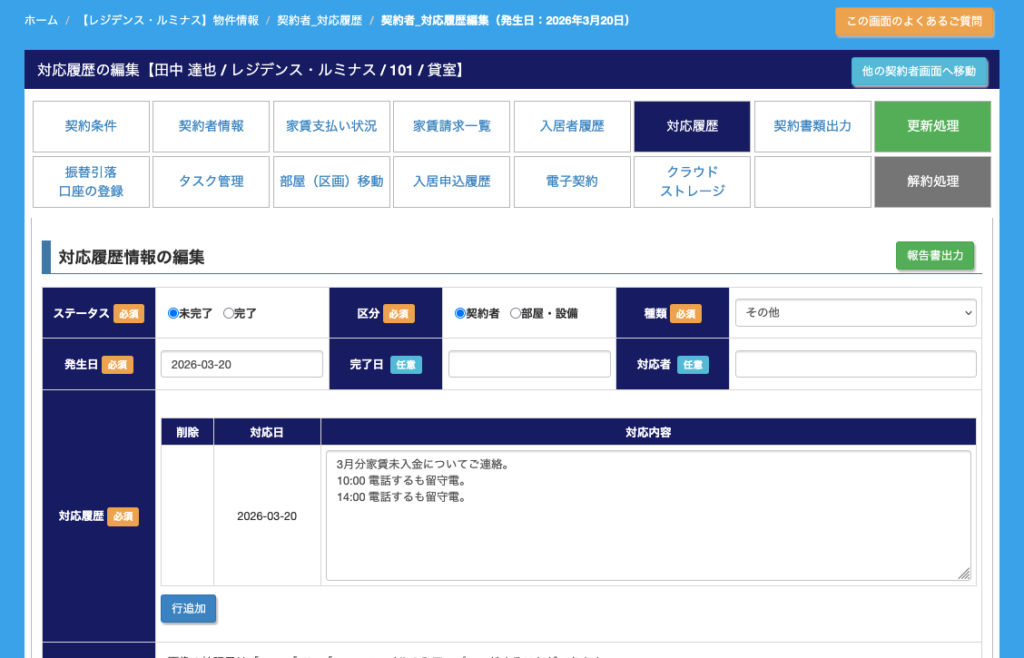 | 区分 | 対象の対応履歴が「契約者」に紐づく内容か、「部屋・設備」に紐づく内容かを選択します。 |