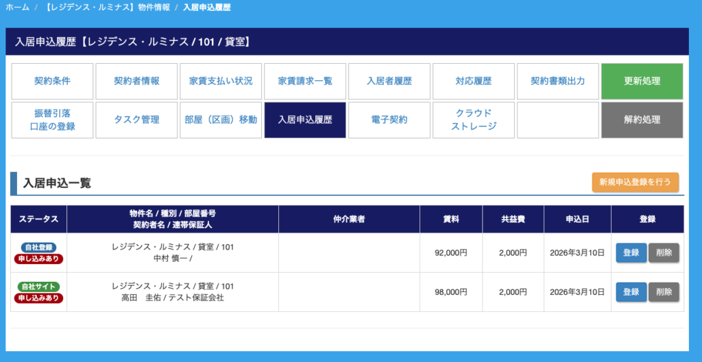 ※該当の申込情報で契約者情報登録を行っている場合は物件名の上に「契約者登録済み」と表示されます。