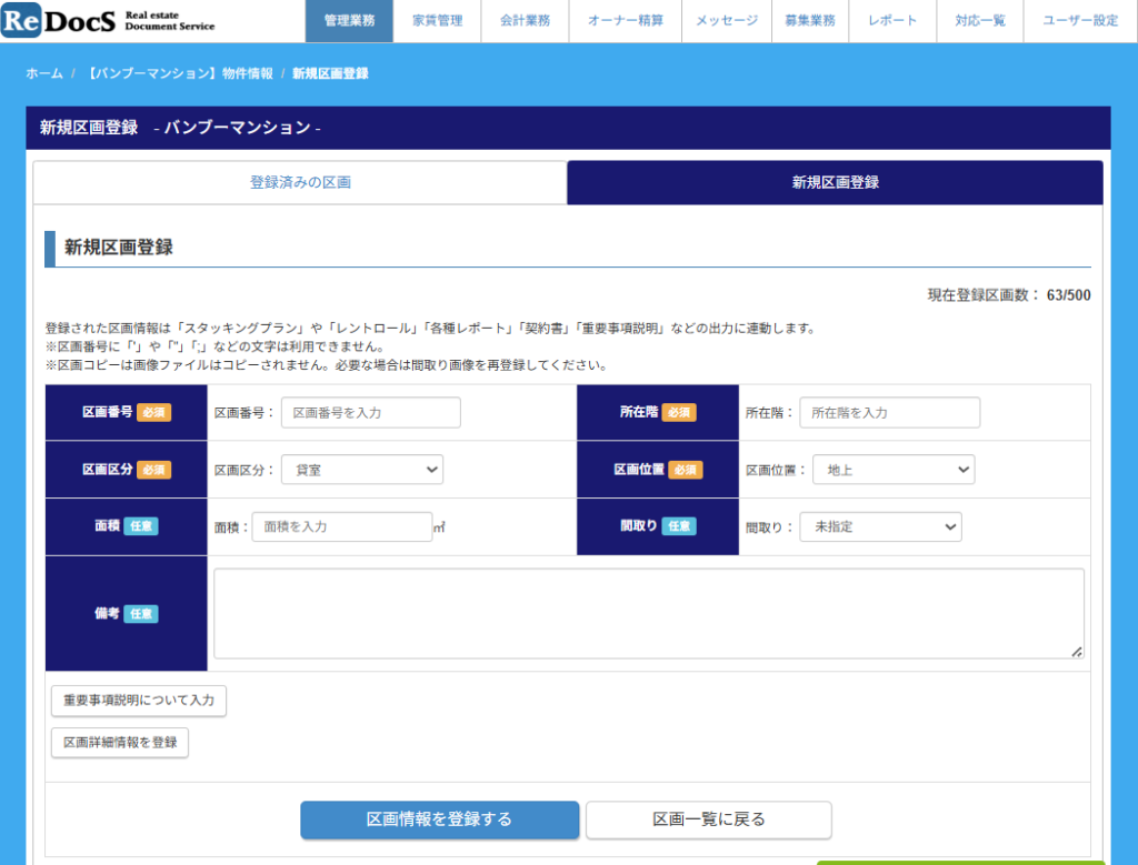 | 区画区分 | 登録対象の区画の区分を選択してください。 貸室、駐車場、バイク置き場、駐輪場、その他から選択できます。 |