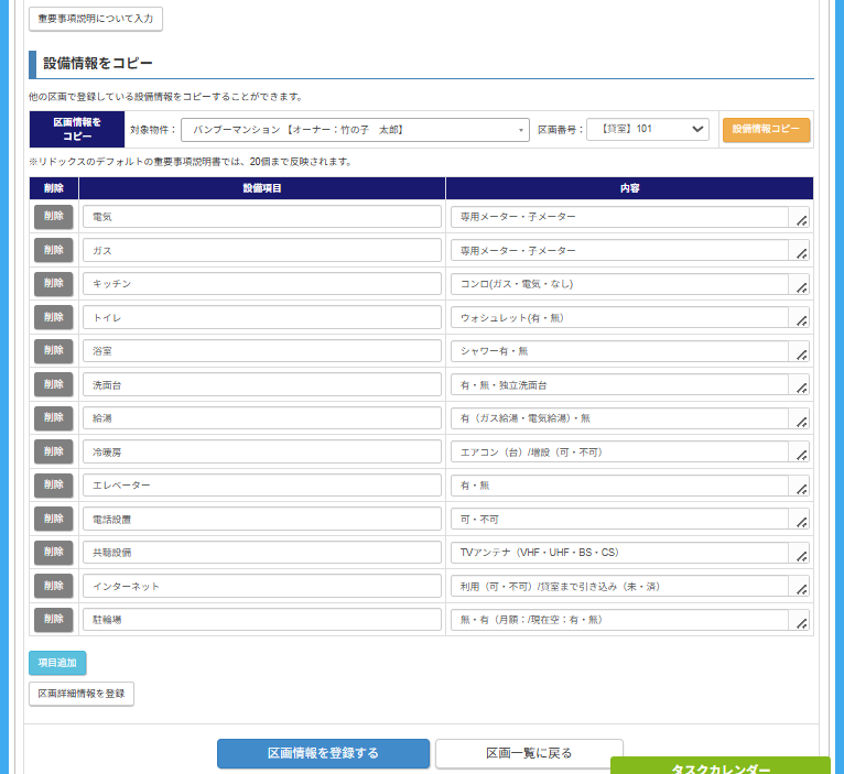 | 設備項目 | 設備項目名をご入力ください。 ※リドックスのデフォルトの重要事項説明書では、上から20個まで反映されます。 |