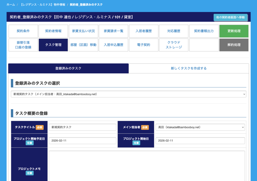 | 登録済みのタスクの選択 | この契約者に紐づいて登録されているタスクが表示されています。 確認・編集したいタスクをドロップダウンリストから選択すると、対象のタスク情報が表示されます。 ※登録済みタスクは作成した順に上から表示されています。 |