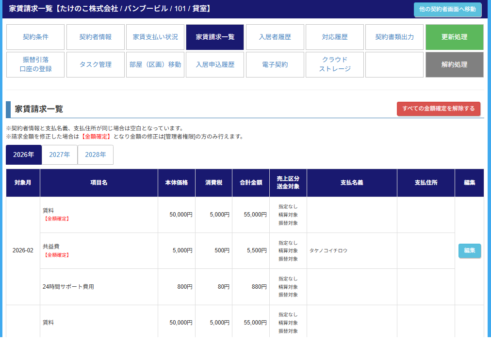 編集クリックすることで、対象月に登録されている「家賃請求情報」の内容を確認・編集できます。